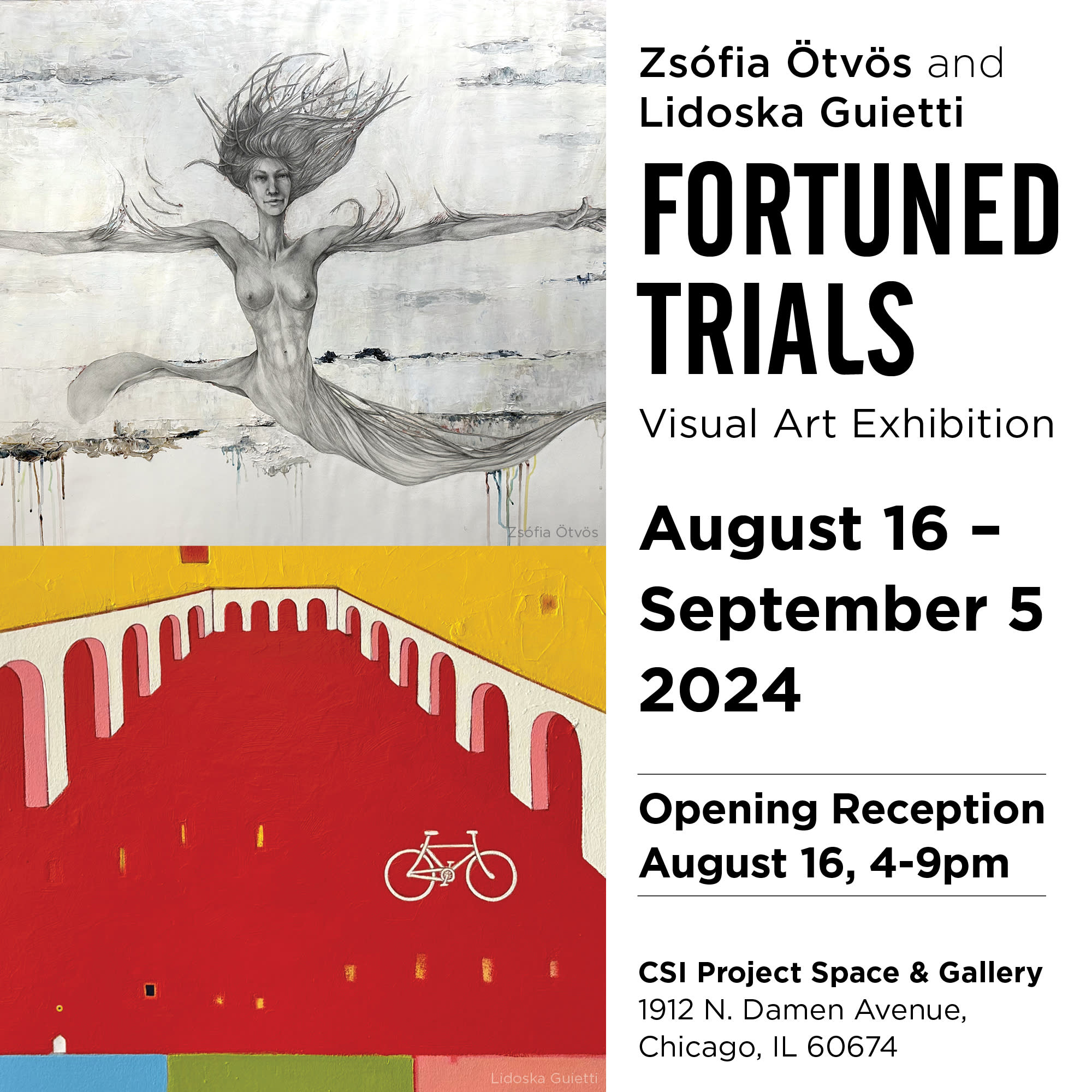 Fortuned Trials is a collaboration between Chicago artists Zsófia Ötvös and Lidoska Guietti, with guest artist Melissa Kolbusz of WIRED jewelry. The exhibition runs from August 16 through September 5, 2024 (every Saturday and Sunday, plus six special events on specific weekdays and also by appointment). The exhibition will be held at CSI Project Space & Gallery at 1912 N. Damen Avenue, Chicago, IL 60647 in the Bucktown neighborhood. There are several special events scheduled and performances by Ric Walker and Kendra Jamaica with Rudy Mendoza. For more information about the artists, exhibition, and special events, visit www.fortunedtrials.com.