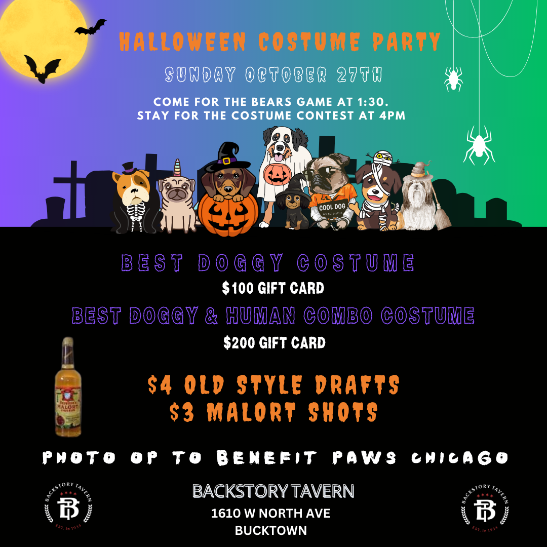 🎃🐾 Get your costumes ready and your pups even readier! Join us at Backstory Tavern for a spook-tacular Halloween Costume Party on Oct 27th at 4pm. Cheer on the Bears at 1:30, then strut your mutt in our costume contest to win $100! Double the fun and dress up with your furry best friend to snag a $200 gift card. 🐶💰 Plus, every pic with your pooch helps support PAWS. Stay for the game, play for the cause, and win big!