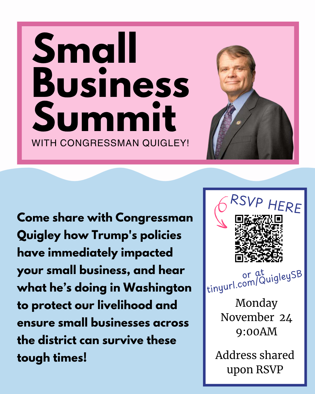 Congressman Quigley invites you to a small business roundtable to address your concerns. From tariffs to inflation, small businesses are struggling but resilient. What challenges are you facing as a small business owner? What policies do you feel need attention in Washington to help you succeed. What local issues are impacting your business? https://tinyurl.com/QuigleySB